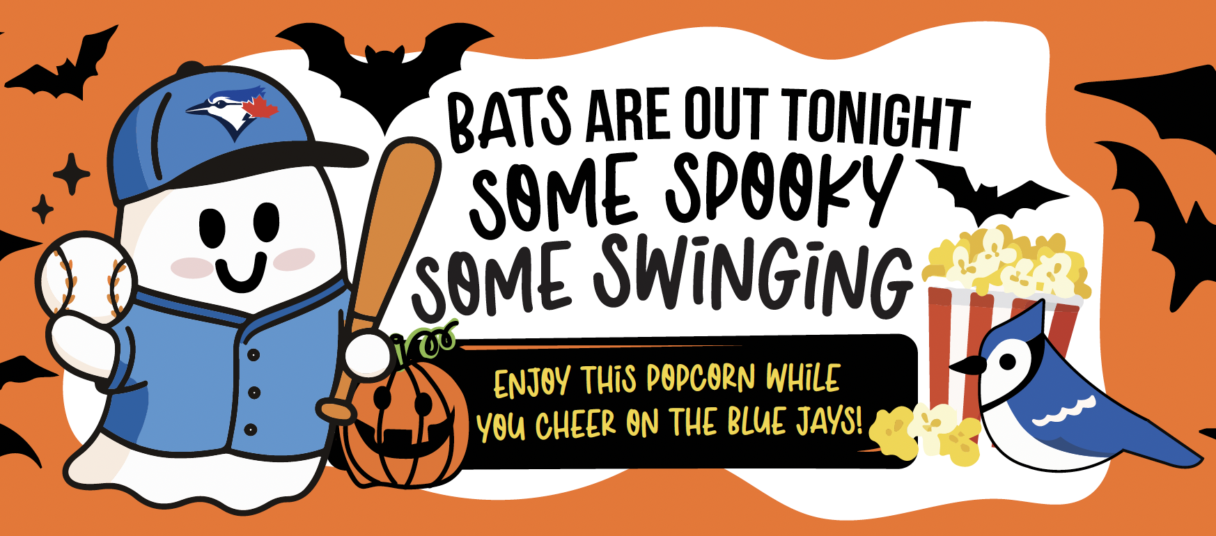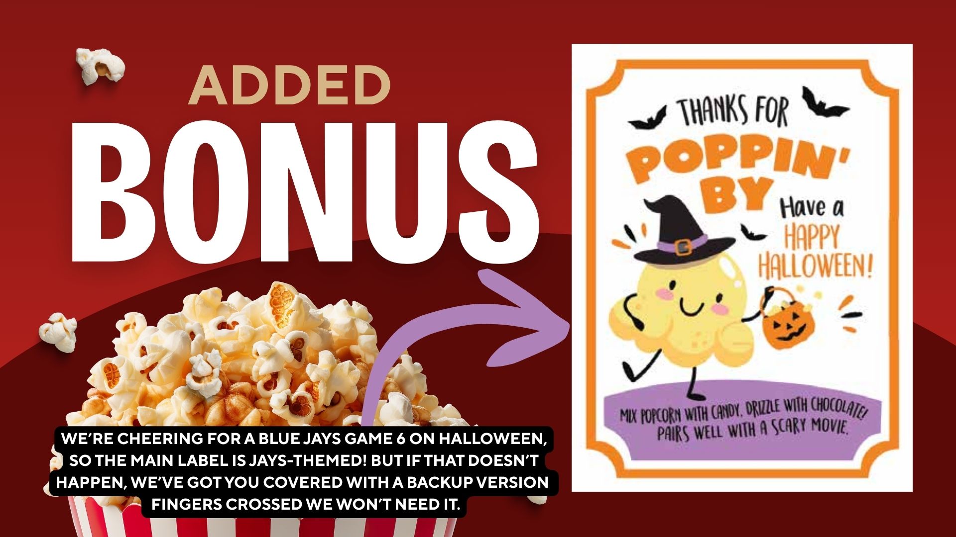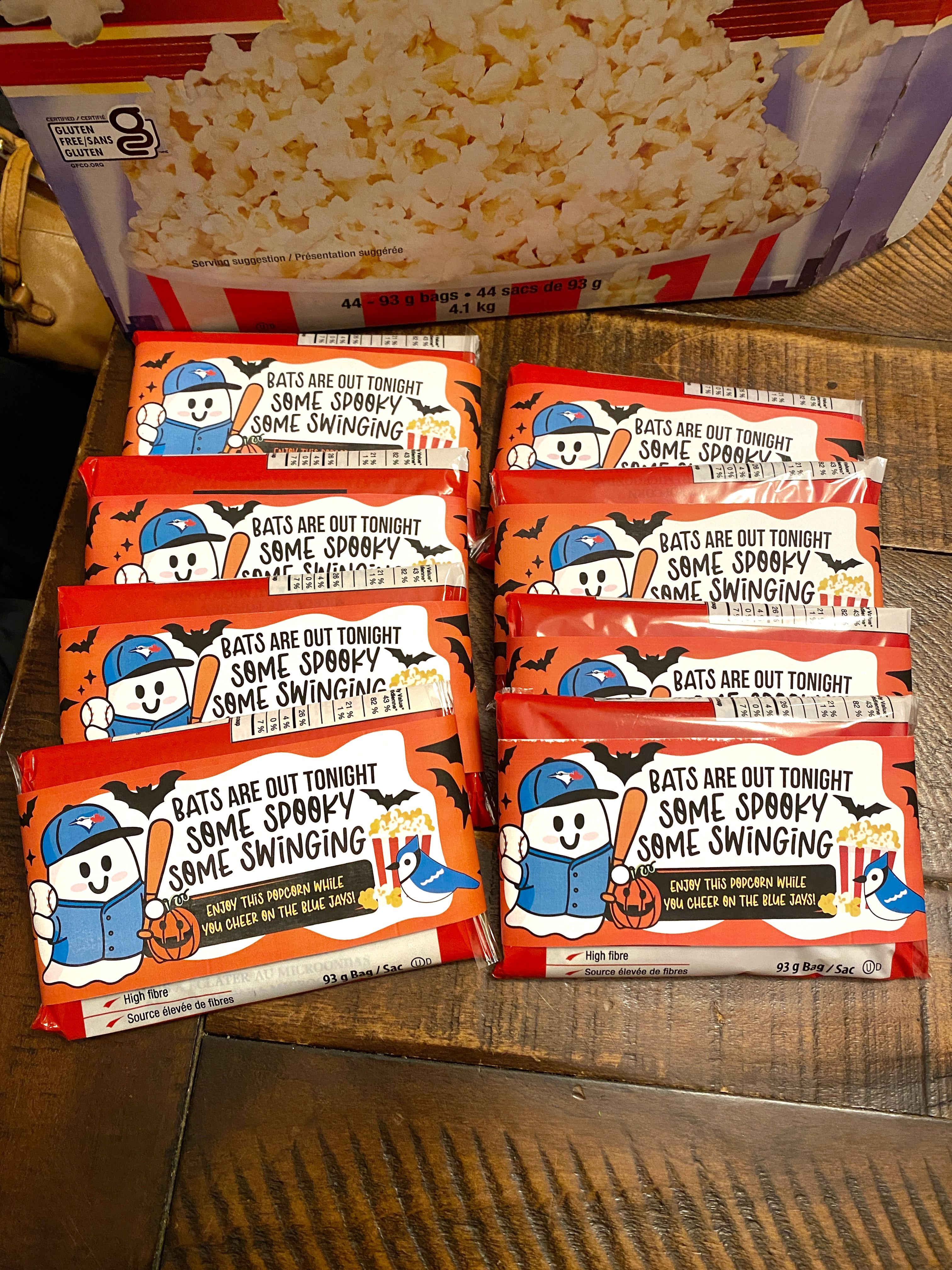 I made a Blue Jays printable label that’s all set up for you - three per letter-sized sheet. Just cut across, wrap one around a microwave popcorn package, and tape it at the back. That’s it - a cute, custom Halloween treat that shows your Blue Jays pride!